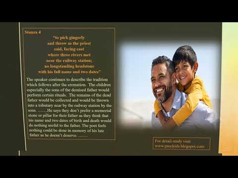 The poem beings with the death of the poet’s father.  After his death the poet realises that his father left may behind. Some are useless thinks like old papers. But few memories and rituals are there, to be a great memory to be with him forever.  The second half of the poem describes the cremation of the father and how the rituals were done according to their faith.  The poet at last talks about an obituary in a local paper which was left by the poet’s father.  His search for it and others things of his demised father. The poem concludes with the importance of the rituals which are inherited from the father and become the best part of life.